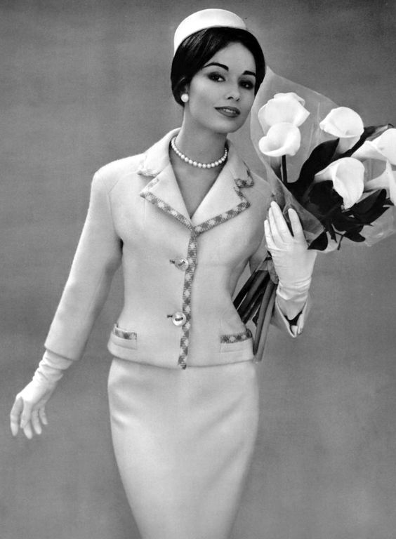 Sondra Peterson in white wool suit with blue and white check trim, featuring a shorter jacket, by Pierre Balmain, pillbox by Jean Barthet, photo by Pottier, 1959.