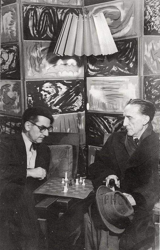 Man Ray and Marcel Duchamp playing chess in Man Ray's studio in 1960 in Paris